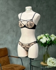 Каркасний бюстгальтер з подвійною чашкою зі стрепами Чашки бюстгальтера складаються з 2-х деталей: основні деталі з вишитої сітки, та додаткові - зі звичайної сітки, з яких виходять декоративні гумки, що перетинаються в центрі грудної клітки.Трусики-бразиліана